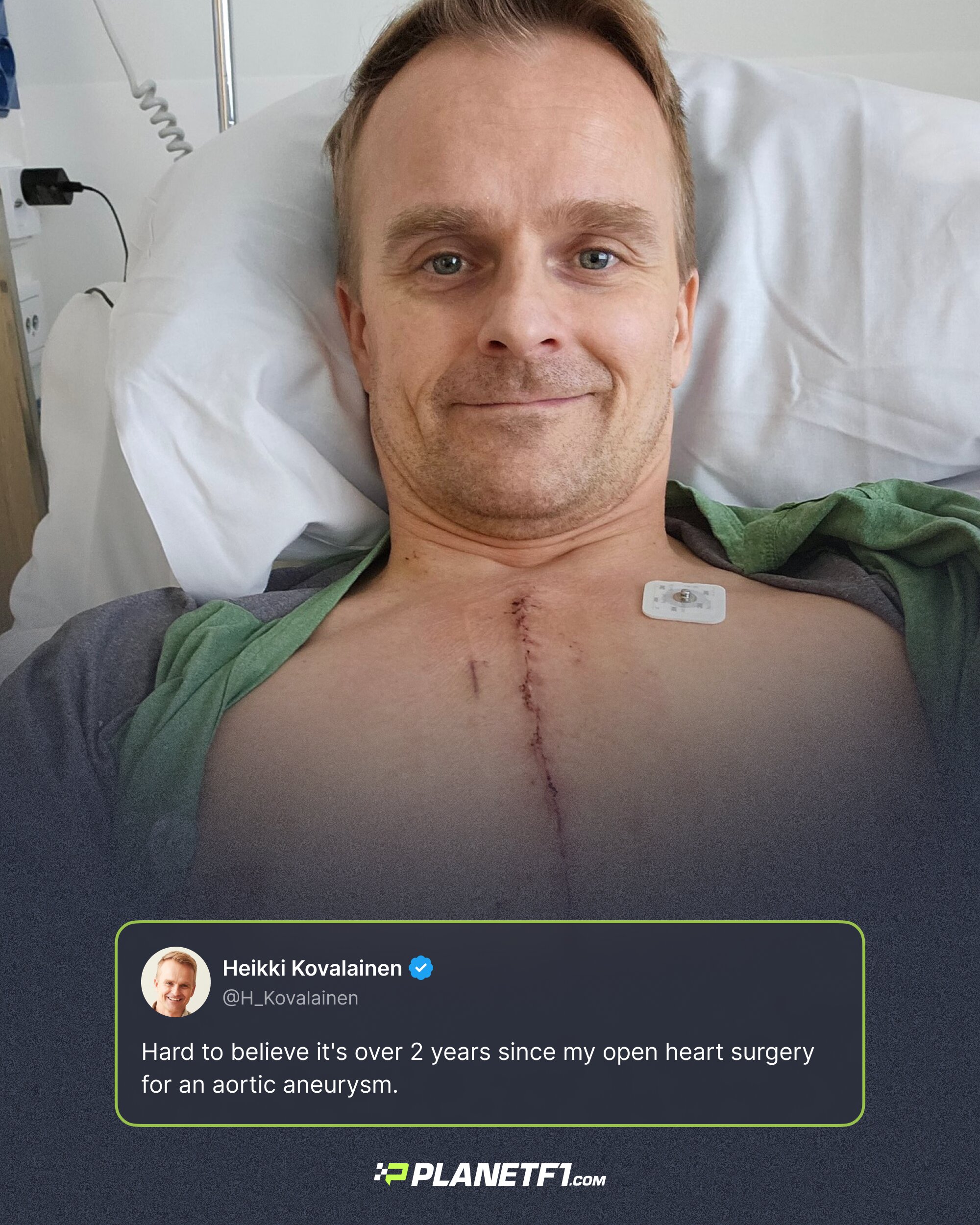 Kovalainen’s post was accompanied by then-and-now images of the scar running down the middle of his upper chest (below).